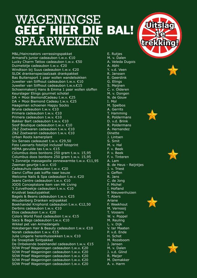 In de maanden november en december zijn er weer de bekende spaaractieweken in het centrum van Wageningen! De ondernemers in het centrum organiseren dit jaar de ‘Wageningse GEEF HIER DIE BAL! spaarweken’. Tot en met 27 december ontvang je bij alle deelnemende winkels bij een besteding van €10 de Wageningse kerstbalsticker. Bij tien kerstballen hangt jouw boom vol en mag je de spaarkaart inleveren.