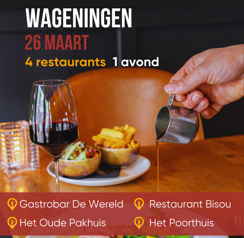 Bij Food La Route draait het om eten en genieten. Deze avond bezoek je maar liefst vier geweldige restaurants; Restaurant Bisou, Het Oude Pakhuis, Gastrobar De Wereld en Het Poorthuis. Je wandelt, proeft en beleeft het samen.