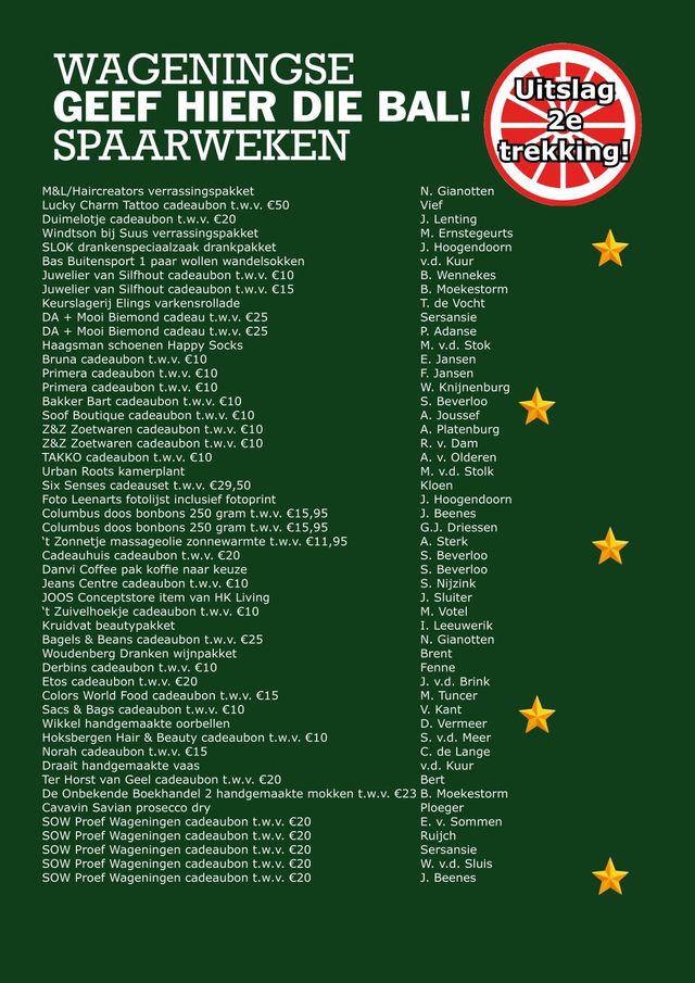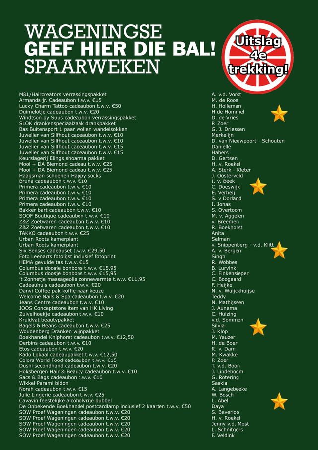 In de maanden waren er weer de bekende spaaractieweken in het centrum van Wageningen! Er waren vier trekkingen en heel veel mooie prijzen te winnen! Bij elke trekking werden er meerdere winnaars getrokken.