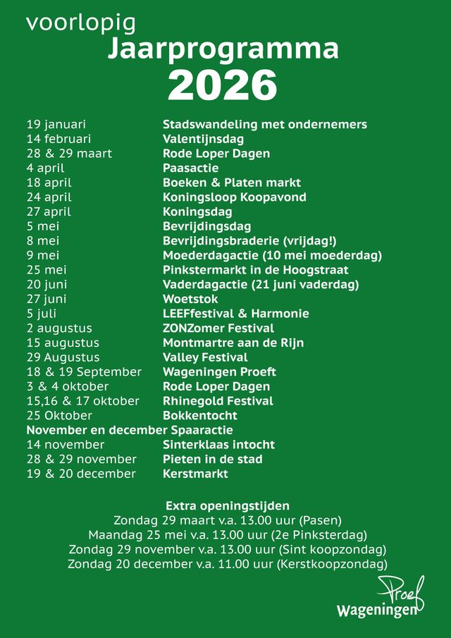 Kijk hieronder voor het voorlopige jaarprogramma van 2026. Heb je vragen of opmerkingen over het jaarprogramma? Laat dit gerust weten via info@wageningencentrum.nl.